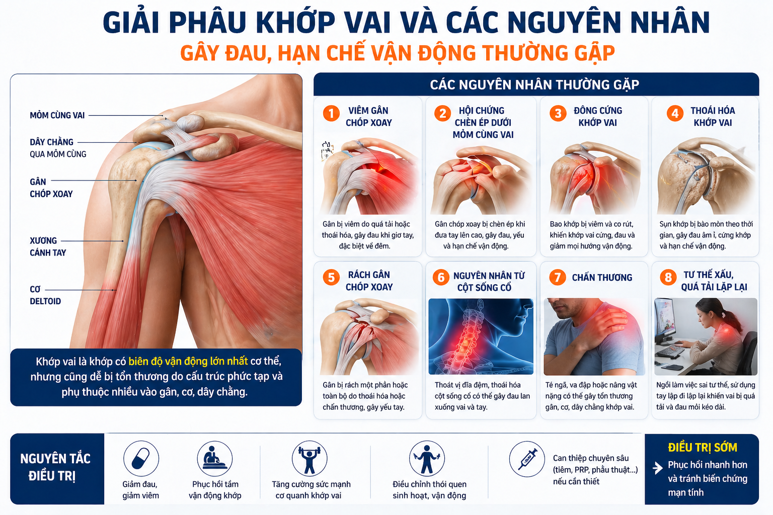 Khớp vai là khớp có biên độ vận động lớn nhất trong cơ thể, cho phép chúng ta thực hiện gần như mọi động tác của tay. Tuy nhiên, chính vì sự linh hoạt này mà khớp vai phụ thuộc rất nhiều vào hệ thống gân, cơ và bao khớp xung quanh.