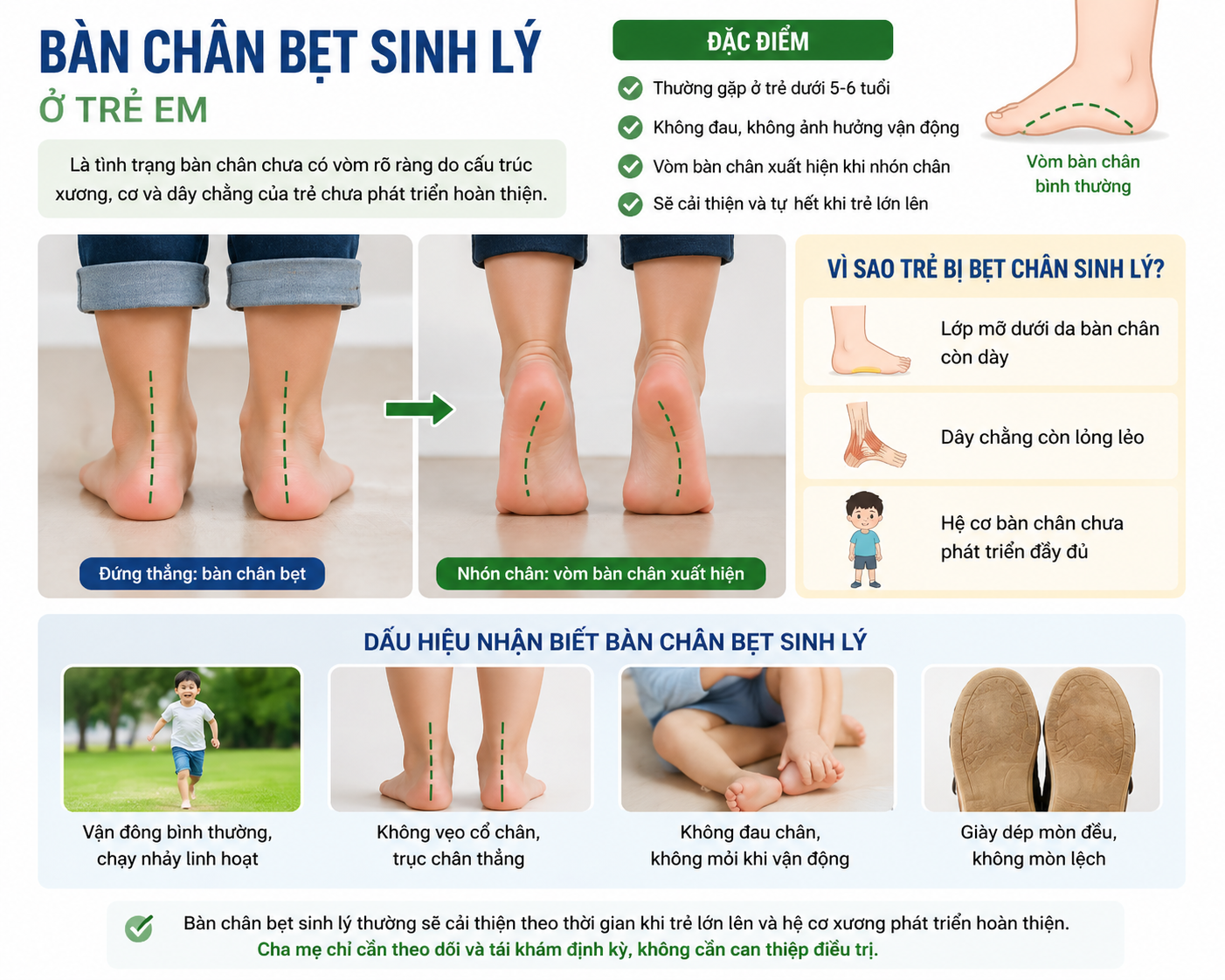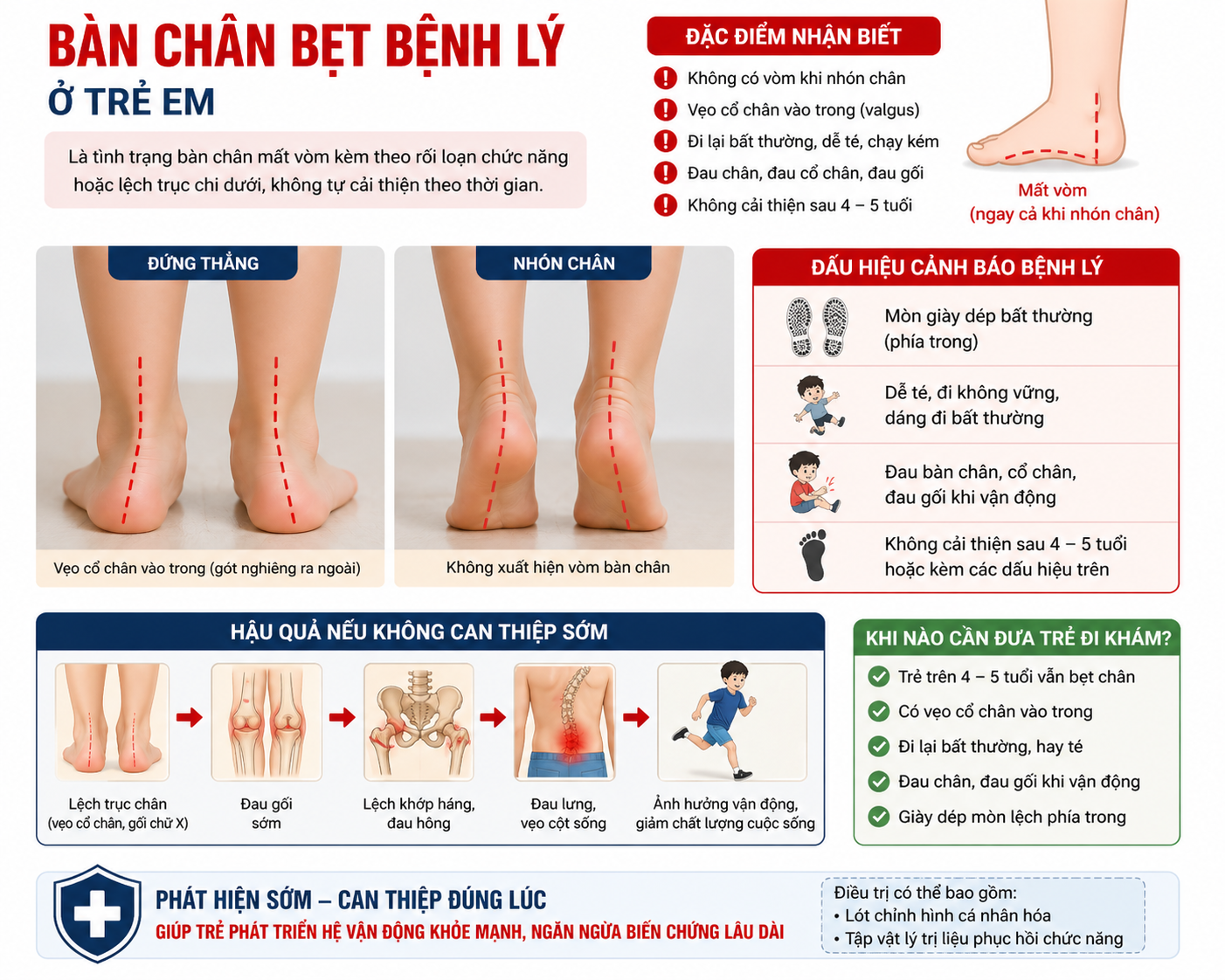 Bàn chân bẹt ở trẻ em không phải lúc nào cũng nguy hiểm, nhưng khi xuất hiện các dấu hiệu như đau, lệch trục cổ chân hay rối loạn dáng đi, đây là những cảnh báo không nên bỏ qua. Việc nhận biết sớm bàn chân bẹt bệnh lý giúp can thiệp hiệu quả và đảm bảo sự phát triển toàn diện của trẻ.
