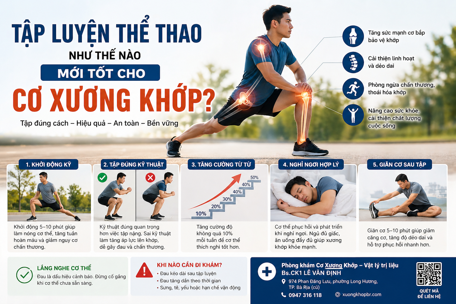Tập luyện thể thao chỉ thực sự tốt cho cơ xương khớp khi được thực hiện đúng cách. Kỹ thuật, cá thể hóa, kiểm soát cường độ và phục hồi hợp lý là những yếu tố cốt lõi. Tập sai không chỉ làm giảm hiệu quả mà còn có thể gây tổn thương nghiêm trọng.