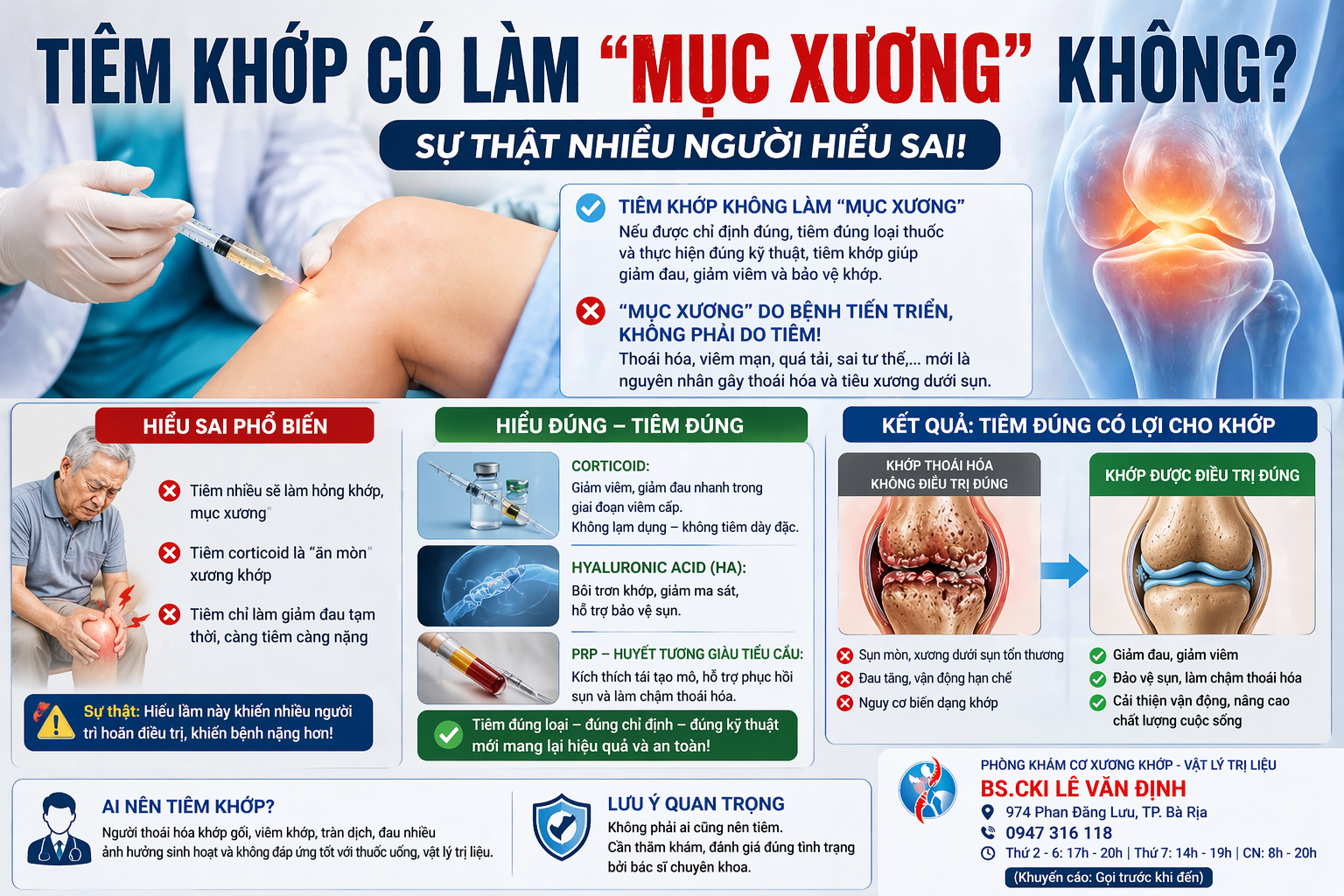 + Điều đáng lo không phải là “tiêm khớp”, mà là điều trị không đúng nguyên nhân và không được theo dõi lâu dài. Nhiều bệnh nhân sau khi tiêm thấy đỡ đau liền chủ quan, tiếp tục vận động quá mức hoặc bỏ qua các biện pháp phục hồi chức năng, dẫn đến bệnh tiến triển nặng hơn. Khi đó, họ dễ quy kết rằng “do tiêm mà hư khớp”, trong khi thực tế là do quá trình bệnh tự nhiên kết hợp với việc chăm sóc không đúng.